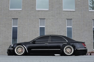 オリジナルのゴールドで塗っていた前仕様も、イベント会場で非常に目立つ存在だった。ナチュラルなブリスターフェンダーに19インチのSSR・プロフェッサーSP3(ホイール)をリムガードツラで決めたスタイリングは、紛れもなくVIPの風格だった。