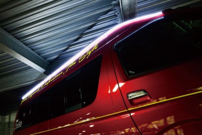 テープLEDをクルマの下部などに装着するドレスアップ手法はメジャーだが、「ビーキャス」のハイエースはじつに巧みな作り込みがされている。