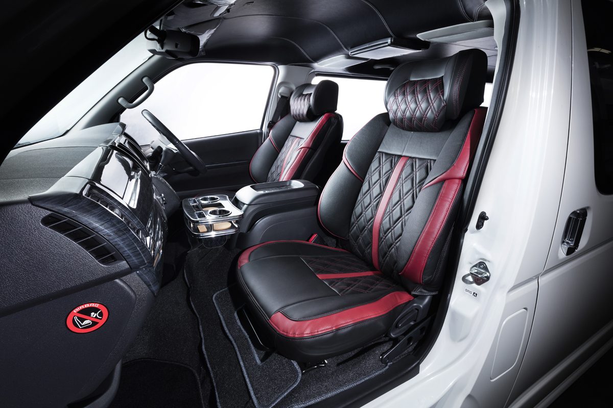 様々なデザインが採用されているハイエース用のシートカバーがさらに進化! 新たなデザインとしてサイドのサポート性能を格段にアップさせたバケットタイプのシートカバーが発売された。