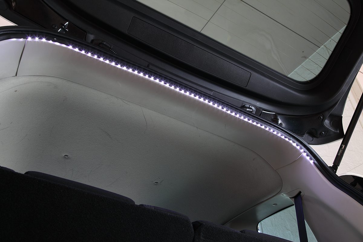 装着する場所は内張りとゴムモールの間。これなら、昼間はほとんど目立たない。電源は純正のラゲッジルーム照明から取れば、純正と同じように点灯させることが可能だ。