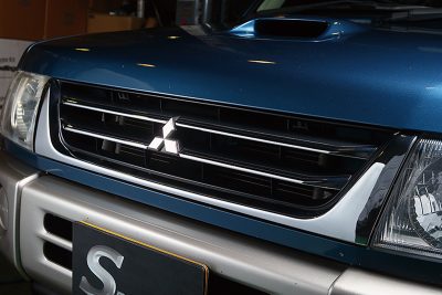 メッキグリルにフィルムスプレーのグロススモークをかければ、簡単にブラッククローム化が可能だ。