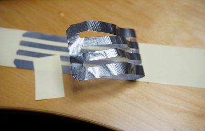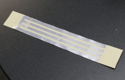 なるべく細くエッジを立てた方がよいので、テープの切断面の形状も工夫しているという。ただし、効果をお試しするのなら、ホームセンターなどにある市販のアルミテープでも十分とのこと。