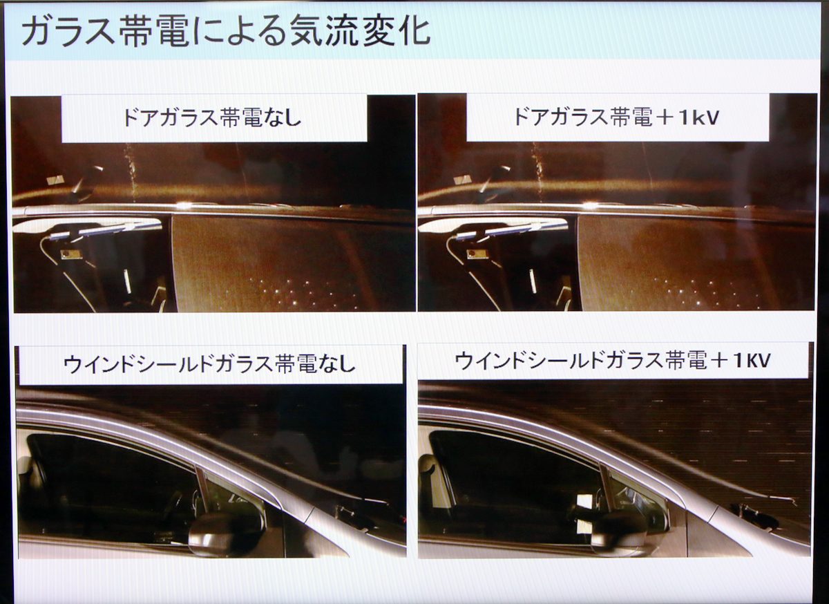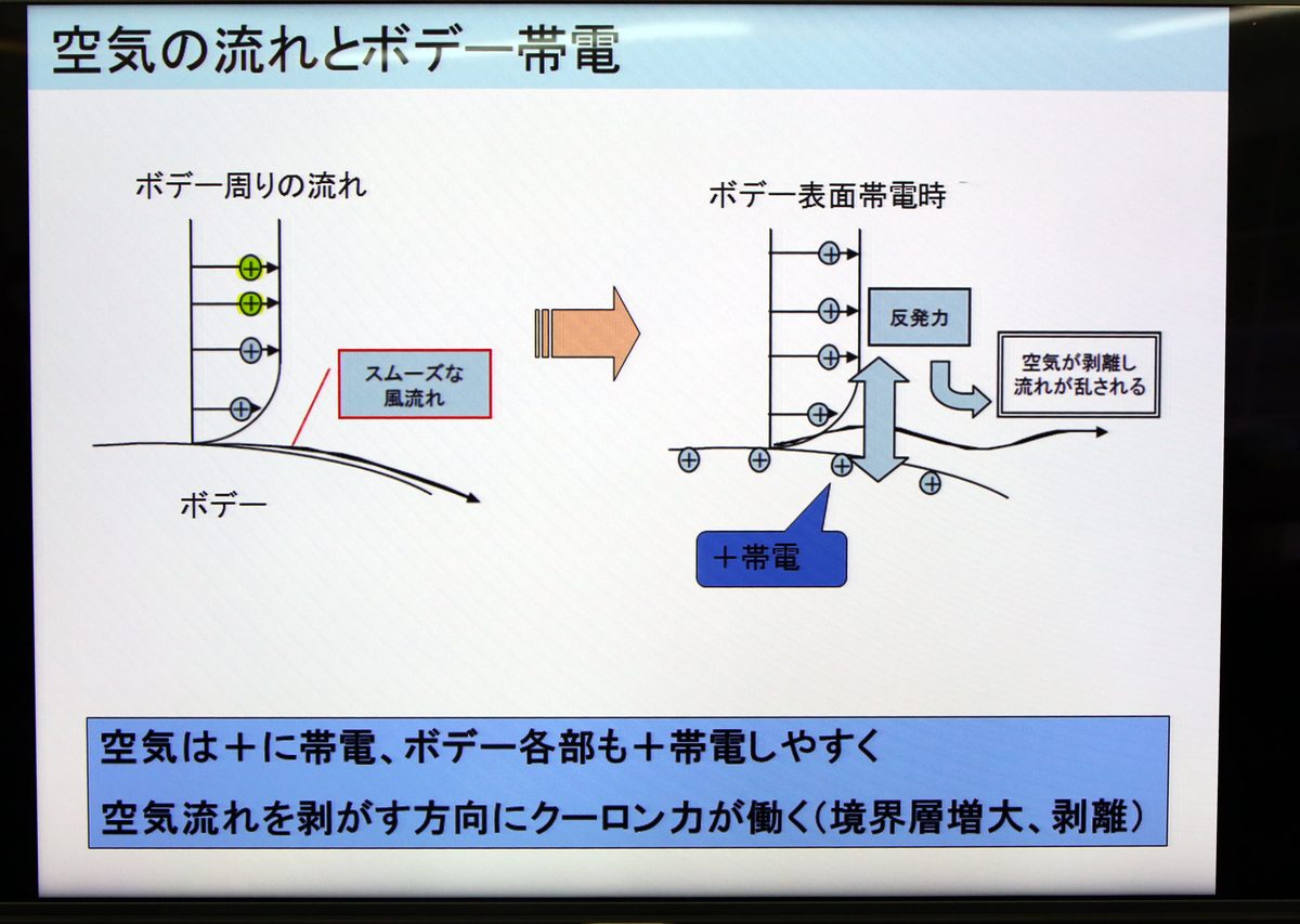 トヨタが走行前後のボディ帯電状態を計測した結果、場所にもよるが10km走行後に4500Vに達した場所もあるとのこと。また、バンパーやガラスの帯電量を変えると空気の流れが目に見えて代わり、帯電のない方がボディ形状に沿った流れになっている。