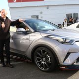 ブースに展示されたC-HRは純正オプションのスポーティスタイルエアロが装着されたハイブリッドで、市販前のHKSのハイパーマックスSスタイルC車高調整式サスペンションとリーガマックスプレミアムマフラーを速攻装着し、テストを繰り返しているという。