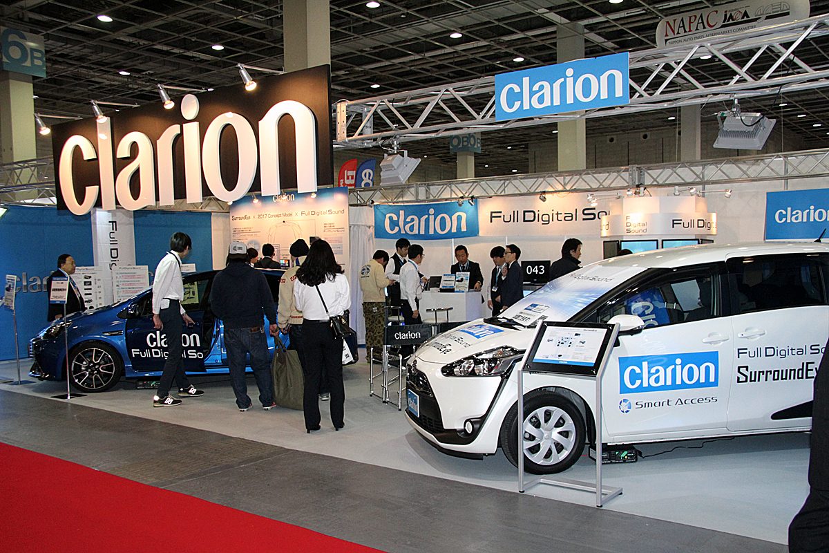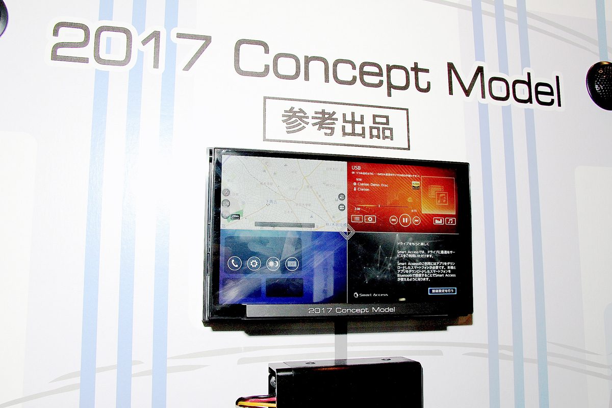 「クラリオン」は昨年デビューを飾った『Full Digital Sound』を搭載する2台のデモカーほか、『2017コンセプトモデル』を展示。『2017コンセプトモデル』とは、9型の画面を4分割し情報を表示できるAVナビゲーション。