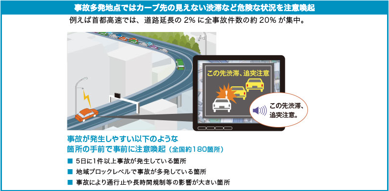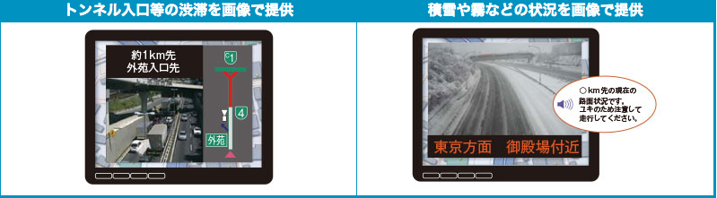そのデータを元に「ETC2.0」と連動するカーナビ上で最適なルートを引いてくれたり、道路的な難所(急カーブなど)や天候などを警告してくれる機能を持つ。さらに地震などの災害発生時には発生状況や支援情報などを受信することもできる。