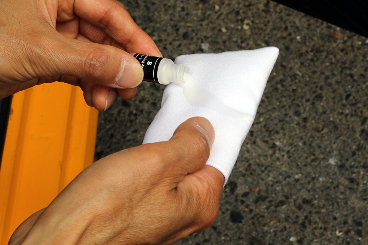 混ざった液剤を付属のコーティング塗布用クロスに付けて、なでるようにステアリングに塗布していく。