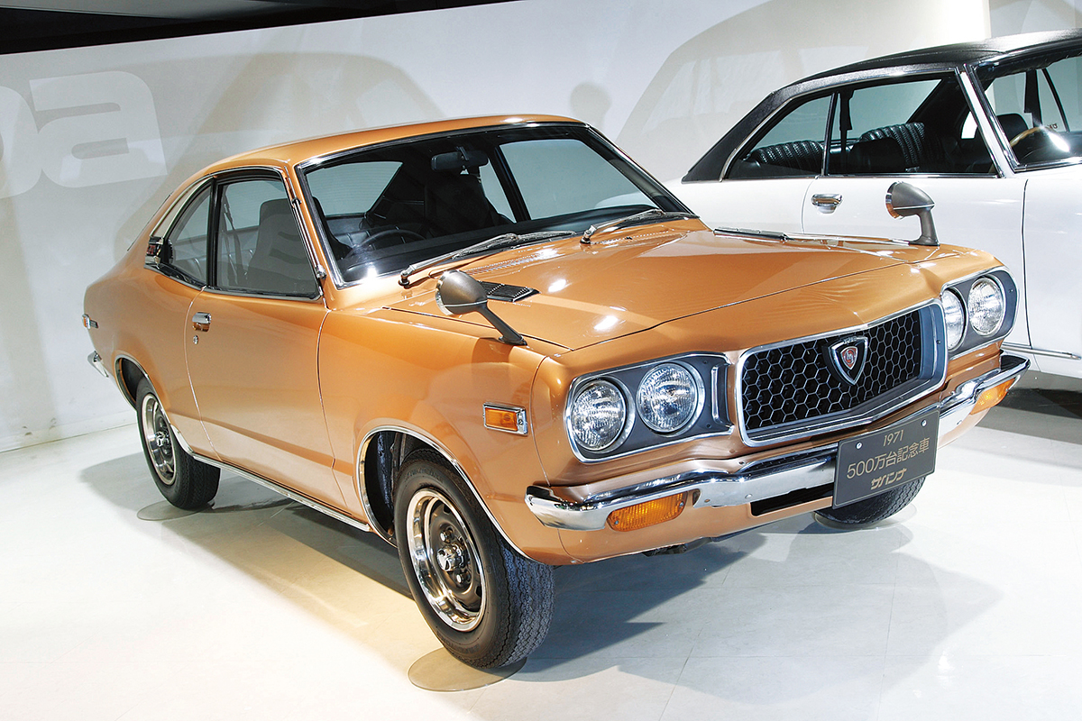 エンジンは、おなじみの13B型ロータリーエンジンを筆頭に、レシプロエンジン搭載車も設定。丸目4灯の流麗な2ドアクーペは、コスモ・スポーツの2シーターではなく5人乗りだったのも特徴だ。