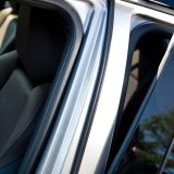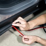 まずは、リアドアの前方部分から。ドア前端部にモールを引っ掛けるように差し込み、両面テープで貼る。専用設計だからカット不要でOK。前後ドアの境目に生じるスキ間をモールが埋めてくれるから、気密性を高めることができるという。
