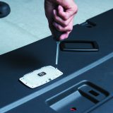 リアゲートのように、樹脂部に設置するなら本体はビス留めでOK。天井のようにモケット部に設置するなら、付属の金属製ステーを使う。