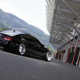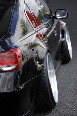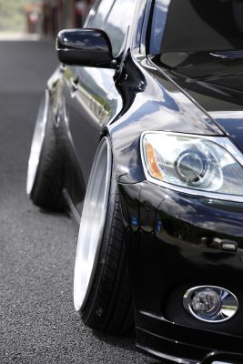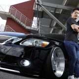 「リムガードのちょい上」辺りで合わせた、エアサスならではと言えるパツパツのツライチ。フェンダーは美しいアーチを作るため、内装のドア内張りまでカットする。キャンバーは「これ以上だと下品に見えるから」と、前後11度で揃えた。