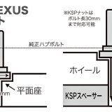 一般的に純正ハブボルトのまま使用できるスペーサーは、5mmが限界値といわれる。「REAL」では純正よりもロング化した専用の平面座ナットと、スペーサーを専用開発。専用ナットを使うことで、しっかりと締め込みできるようにした。ケイエスピー KSP リアル REAL スペーサー トヨタ レクサス