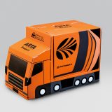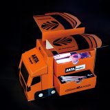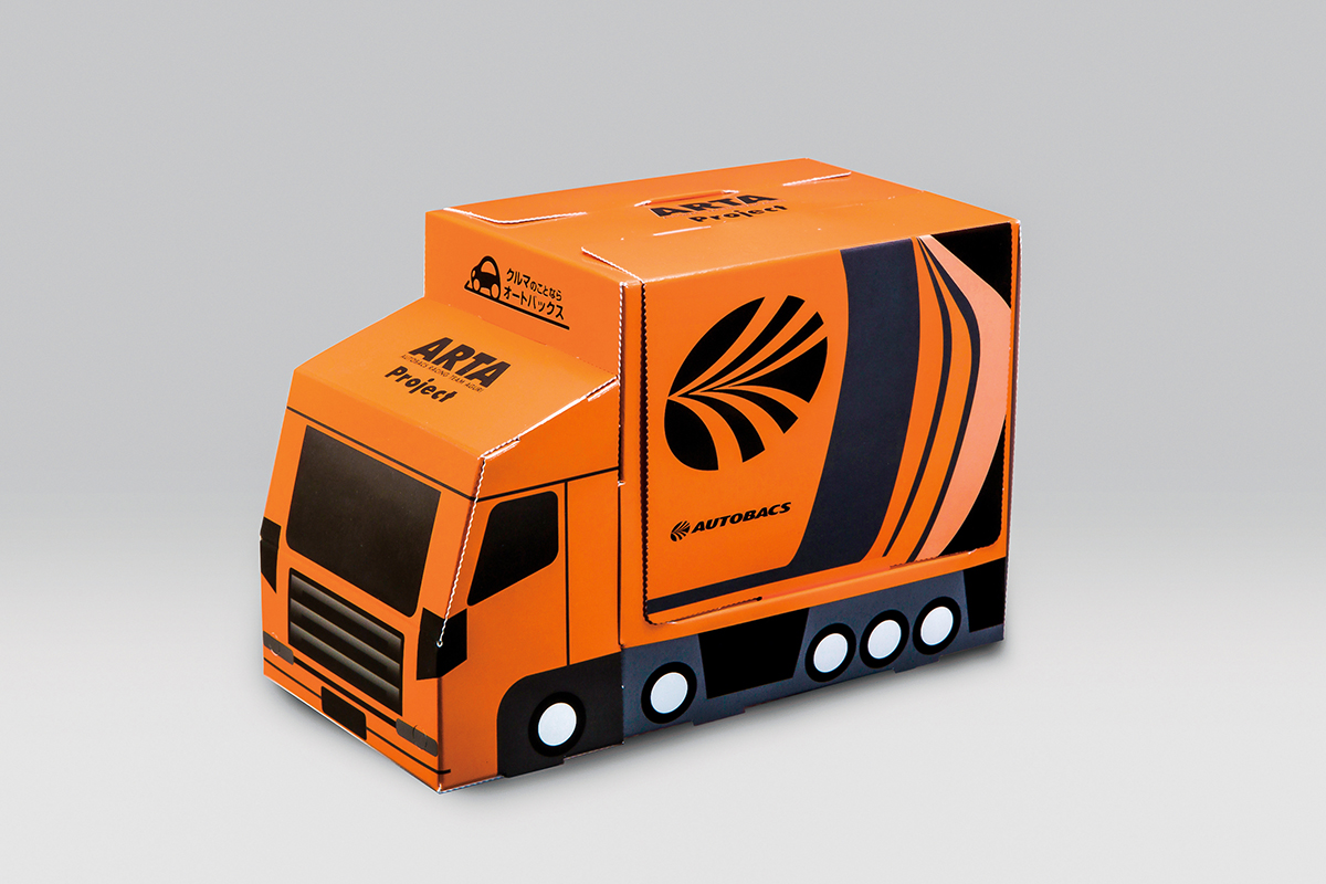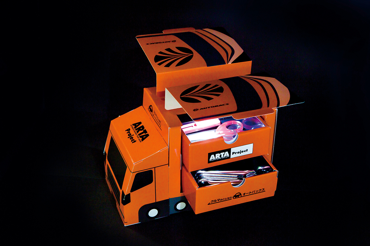 製作できるのは写真のトラック。しかも、ペーパークラフトの中にはエーモン製のLEDが内蔵され、車体側面にある引き出しを開けるとLEDが点灯するという凝った作りに。