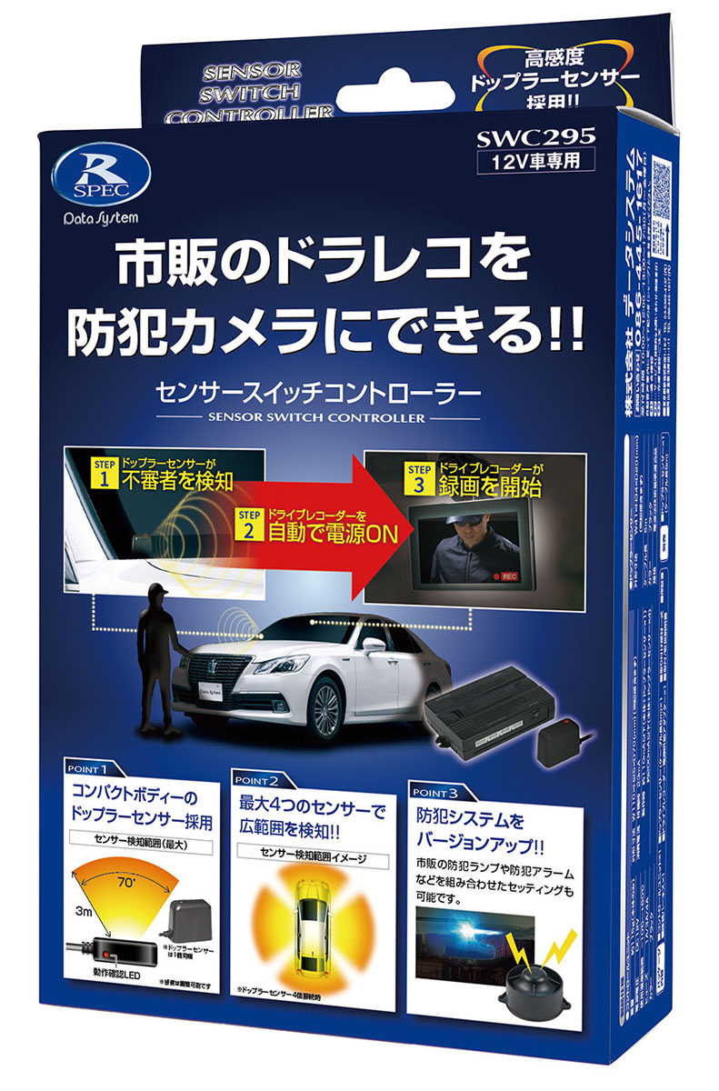 下の写真の『センサースイッチコントローラー(SWC295II・1万2800円[税抜])』は、駐車中のクルマに不審者が近づくなどして『ドップラーセンサー(SWC-S2・4800円[税抜])』が反応すると、12Vの電圧を出力。連動しているドラレコの電源が入り録画を始める。もちろん、バッテリー上がりを防ぐスリープモードも搭載している。