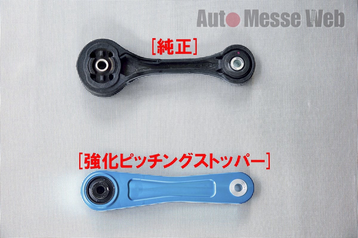 純正のゴムブッシュでは動きを抑えることが難しい。そこで、強化ゴムブッシュとリジッドマウントの強化タイプに交換することで、加減速時のトランスミッションの前後方向の揺れを抑制。MT車はシフトフィール向上の相乗効果も発揮してくれる。