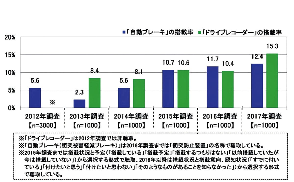 一方で、価格下落を防止しようということで高機能化モデルが相次いで登場。なかでも前方衝突警報や車線逸脱警報といった安全運転支援機能の搭載が急速に普及しており、今ではドライブレコーダーの2割程度にまで、搭載比率が高まっている。