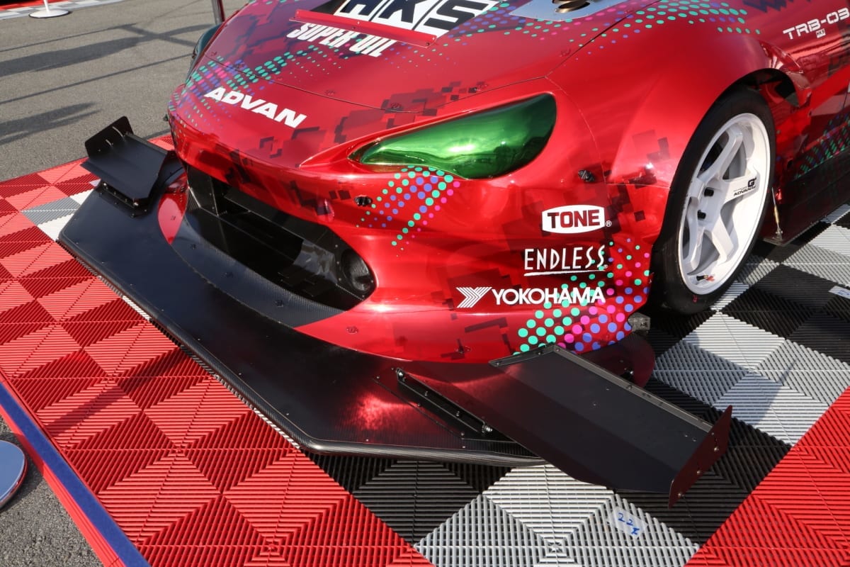 「86」がベースで、筑波サーキットのFR車最速タイムを狙う「TRB-03」。見るからに強烈なダウンフォースを発揮するエアロパーツを装着し、ノーマルをモディファイしたようなボディは、実はカーボン製に変更されている。