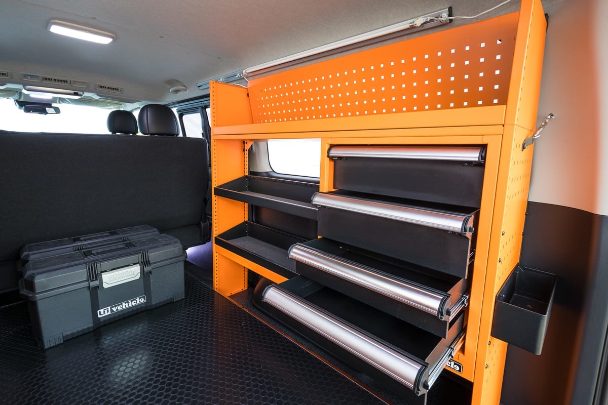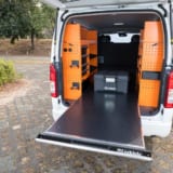 脱着が可能なオプションホルダーなどももちろん用意されている。また、最大300kgの積載能力をもつスライドフロア。段階ごとのストッパーも装備し、荷物の出し入れにはこれがあるととっても快適。特に仕事では重宝するシステムだ。