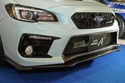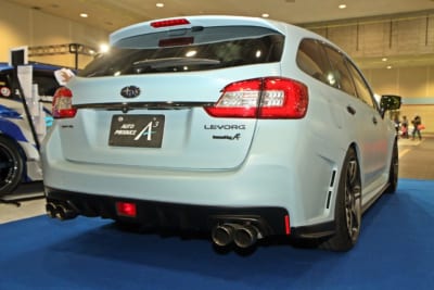 ブース内でS208を彷彿とさせる「クールグレーカーキ風ラバーディップ塗装」を纏った「レヴォーグ」を出展しているのは、関西の代表的なスバル車専門ショップとして支持されている「オートプロデュースA3」。本来設定のない6速マニュアルを搭載し、フロントマスクは同社の新作バンパー『AGRESS WRX TYPEフロントバンパー FACE2』を装着。