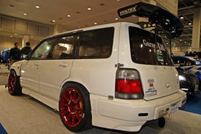 ヒカリモノ系で絶大な人気を誇る「ヴァレンティ」は、現在人気沸騰中のレヴォーグ用LEDテール装着車を出展。純正デザインの良さを生かしつつ、フルLED化。ウインカー部はトレンドのシーケンシャル(流れる)タイプとなっている。純正では点灯しないバックドア側のテールランプもしっかり点灯するなど、細かいこだわり部分もぜひチェックしてほしい。