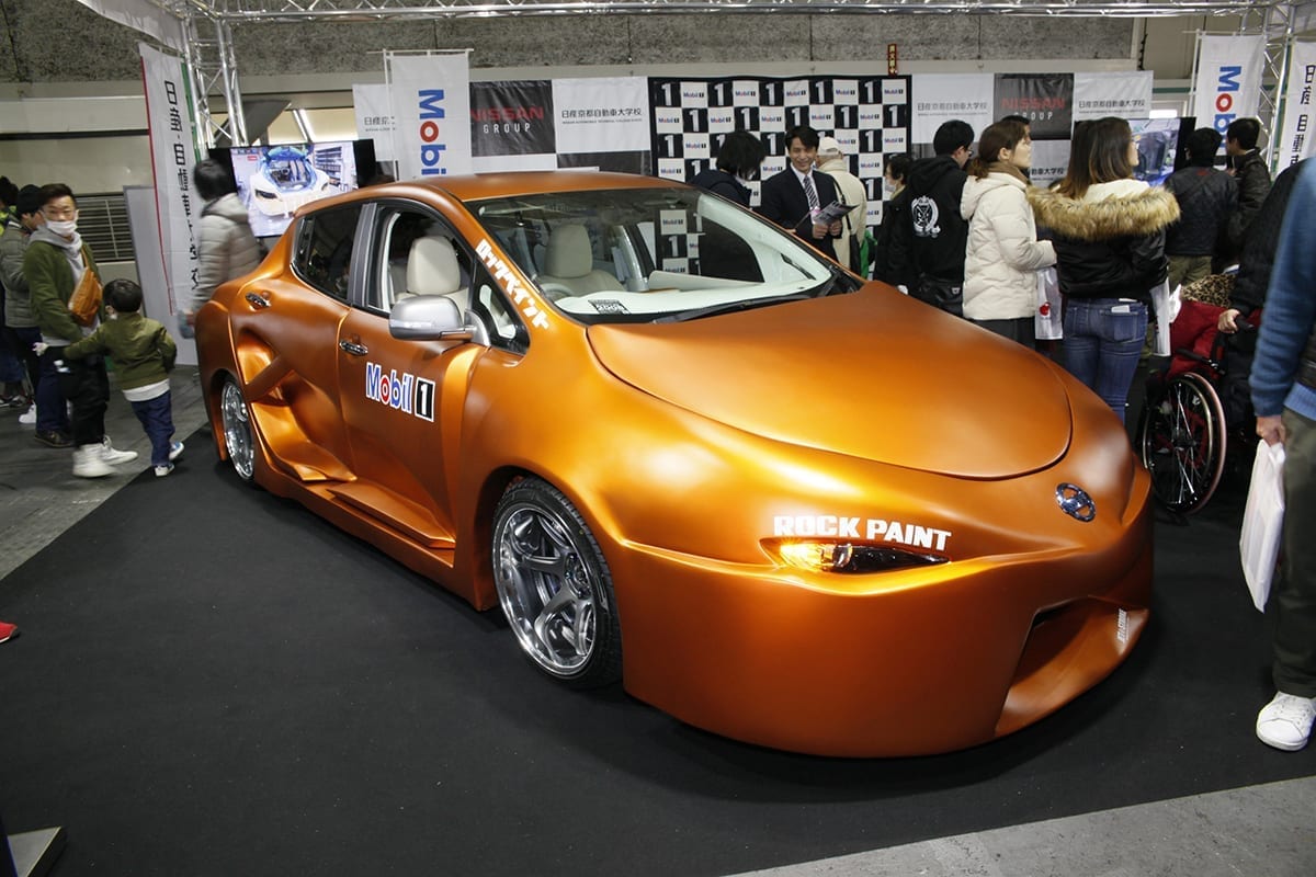 自動車整備士を養成する「日産京都自動車大学校」では、カスタマイズコースを卒業する学生が製作した2台を披露。ボロボロだったベース車へ、日産・S15型シルビアのパワートレインを移植して蘇らせた日産・KB10型サニーと、もともと近未来なリーフを”さらに近未来”というコンセプトで製作した日産・リーフ。