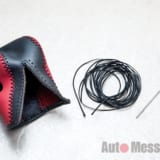 まずは両面テープを使って、ステアリングに貼り付けていく。レザーにはあらかじめステッチが施されていて、このステッチをすくいながら縫い合わせていくだけ。