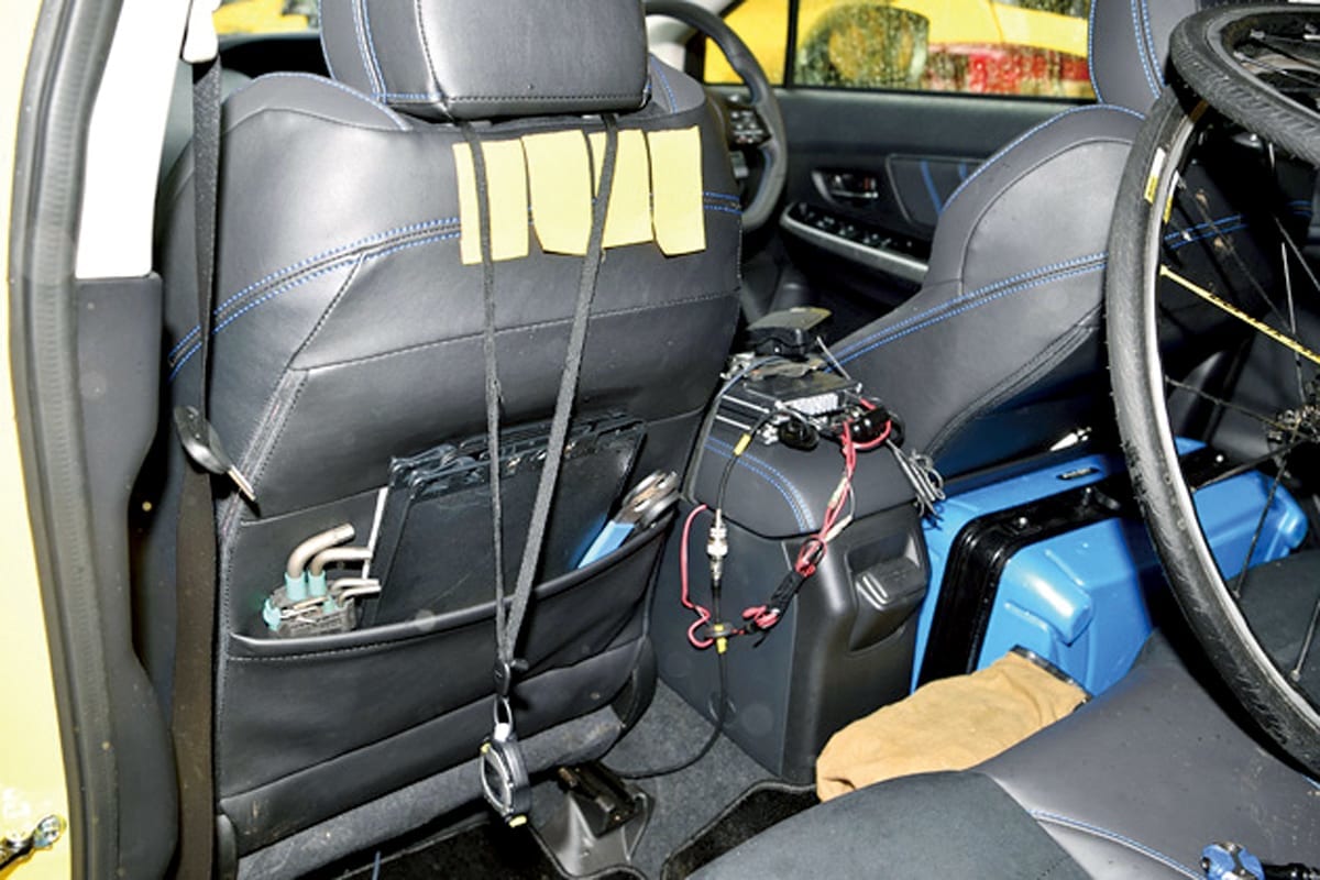 ドライバーのほかにも、テクニカルスタッフが後席に同乗。サポートに必要な工具をはじめ、さまざまな機材は後席に搭載されている。