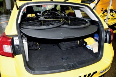 今年からスペアバイクごと交換するように変更されたため、スペアホイールはラゲッジに満載することなく、2本のみ搭載。