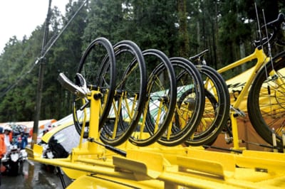 レース中は各チーム1台ずつ、スペアの機材(ホイールやスペアバイク)やドリンク、補給食などを載せたチームカーを一緒に走らせ、選手のサポートを行なっている。