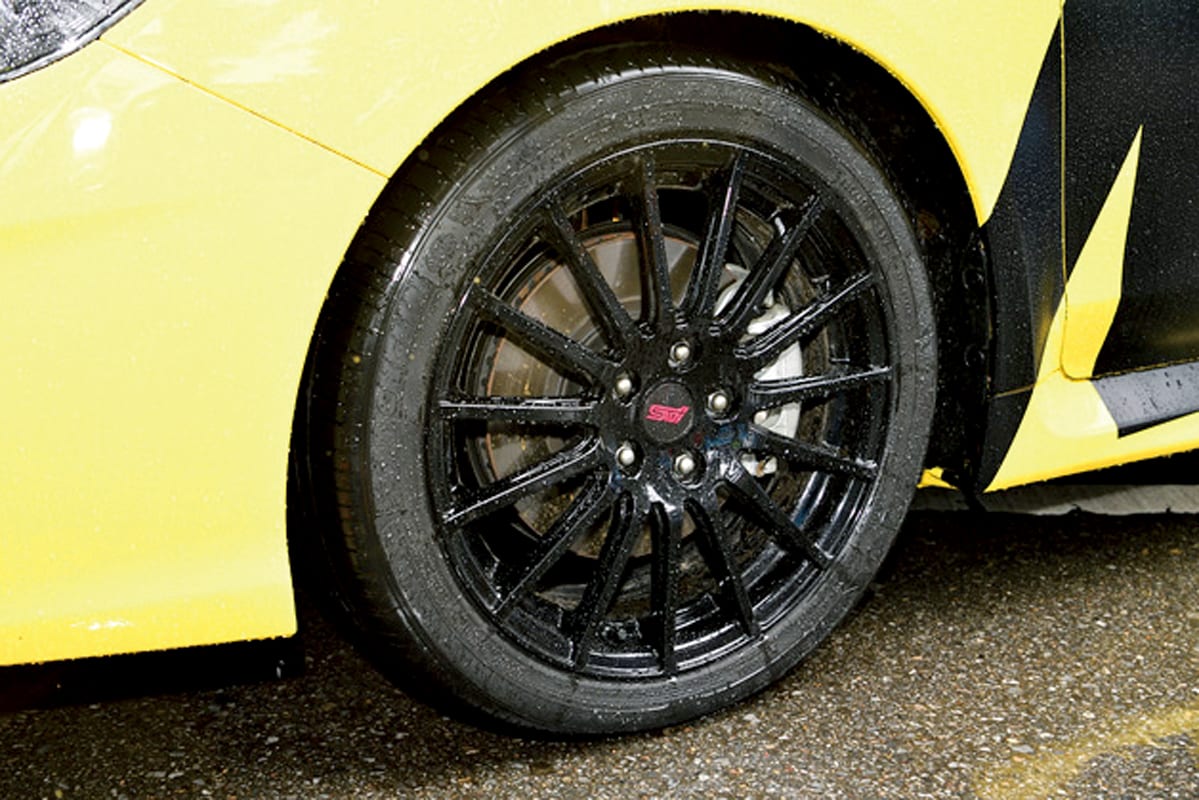 足もとには「STI」製の18インチホイールセットを装着。イエローのマヴィックカラーが映えるブラックカラーを採用した。