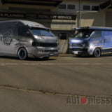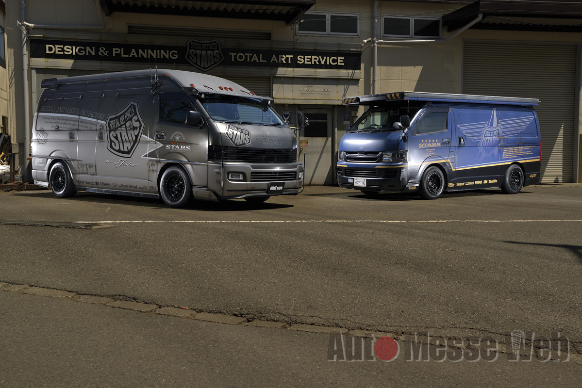 現愛車のトヨタ・ハイエース スーパーロングは、遊び用としてこれまでのクルマ同様にすべてをDIY製作。息子サンが乗るフラットデッキ付き工作車(右)を仕事用として活用している。