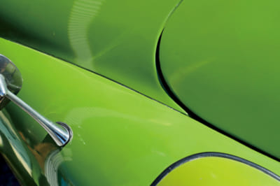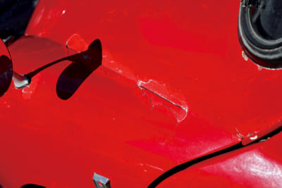 画像右の赤の個体のように、サブロクに詳しくない業者さんが塗装するとフェンダーのつなぎ目をパテ盛りして塗ってしまいがちで、中に湿気がたまって内側から錆びやすくなるという。岩田さんも後悔した。画像左のグリーンの個体は健全な状態なので、これを基本としたい。