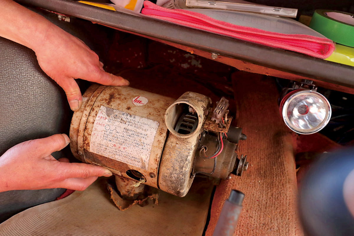 岩田さんはオルタネーターを現代のクルマ用に変えてカーナビやETCが普通に使えるようにしているが、空冷エンジンの難点として冬の寒さが一番辛いとのこと。それは当時も問題視されていたようで、なんと助手席に灯油ヒーターを装備して対応。灯油ヒーターのメーカーは今も修理の対応をしてくれるというからすごい。