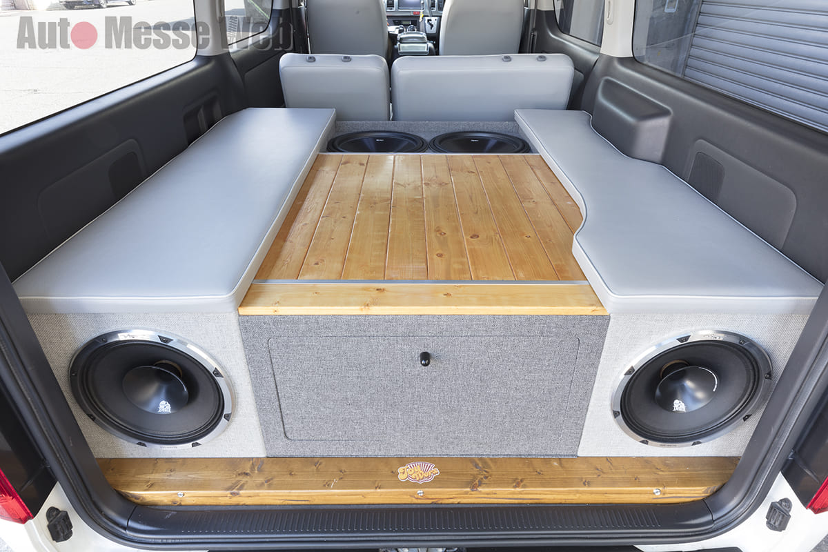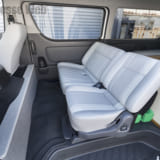 このハイエースもエスティマ用のシートをセカンドシートに採用し、フロントシートに合わせて張り替えを行なっていてシンプルに。しかし、しっかりとコーディネイトされていた。
