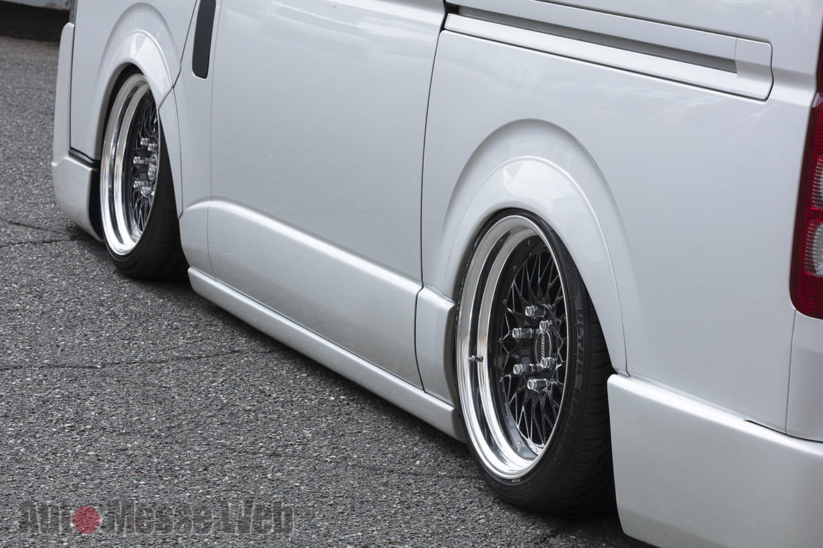 純正ワイドボディのバンパーを加工し、ワンオフのリップスポイラーを装着。リアは「レガンス」の『バンパースポイラー』を同じく加工することで、シンプルなスタイリングに仕上げられている。