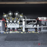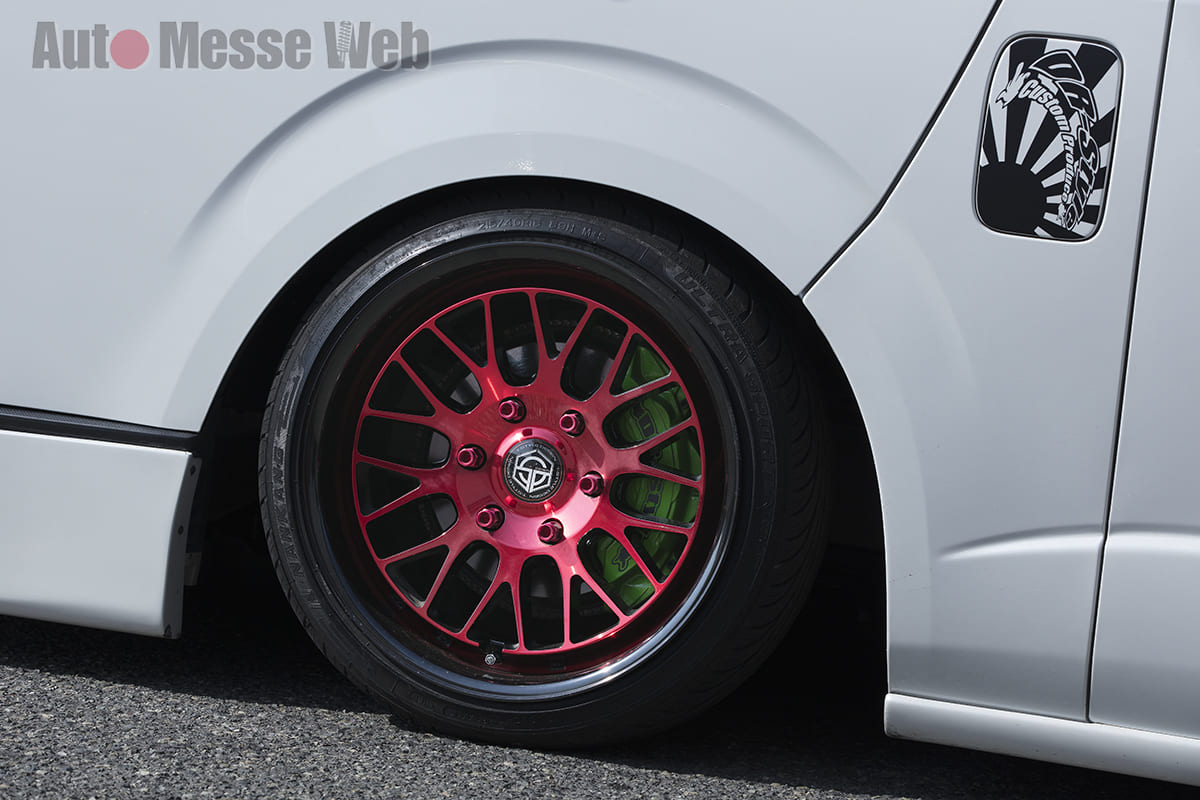 そのサスペンションに組み合わせるホイールは「T.S.Dスタイリング」の『エックストゥリー』。フェンダーを叩きだしで作り上げ、すっぽりと納める。ヘッドライトはワンオフでレッドのラインを投入した。