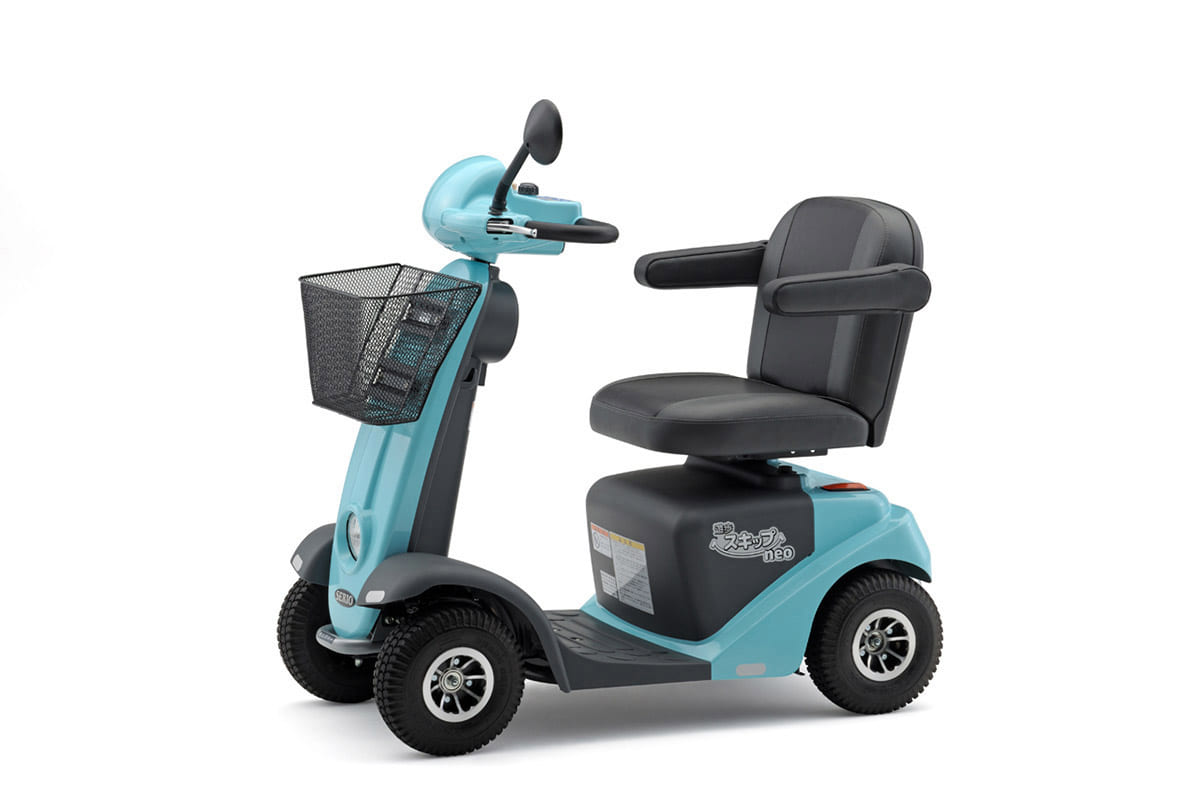 ひとくちにシニアカーと言っても、各車とも特徴があります。基本的には、いずれも4輪がボディの四隅に配置され、26センチから30センチ程の外径を持ったタイヤを囲むように泥除けがついており、前カゴが標準装備、肘掛けと背もたれの付いたシートに座り、足を揃えてフロアにおくことができるデザインです。