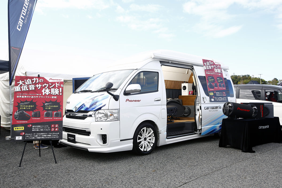 10月7日大阪市・舞洲スポーツアイランドで開催しているワゴン&トヨタ・ハイエース&軽自動車のドレスアップの祭典「スーパーカーニバル2018」の「パイオニア」ブースでは、ドレスアップしたトヨタ・ヴェルファイアとハイエースの2台のデモカーを展示。