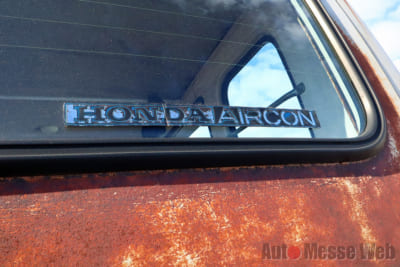 細かく見渡すと、ヘッドライト横の安全ポール、マーシャル社のヘッドライト、熱線入りのハッチガラス、マットガード、ドアバイザー、フォグランプなどなど、オプションパーツの数々はマニア垂涎ものばかり。後付けしたクーラーやオートマチックのエンブレムは、錆びたボディにあわせて劣化した純正部品を探して取り付けたそうです。
