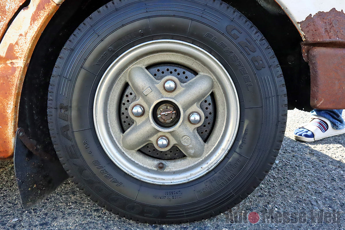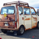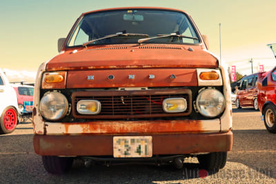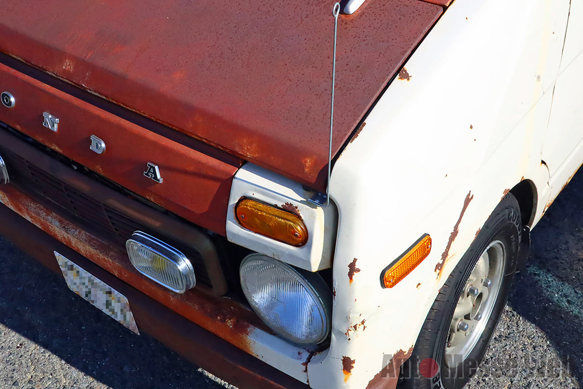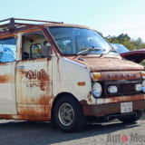 なかでも、ひときわ存在感を放っていたのが”錆びだらけ”のホンダ・ライフステップバン(以下:ステップバン)。カスタム界では、新しいクルマを古びたようにアレンジする”エイジング塗装(錆風ペイント)がありますが、コチラは正真正銘の”サビ”。オーナーの近藤サンによると個体は昭和49年式で、ボディ外板は当時のままだそうです。