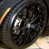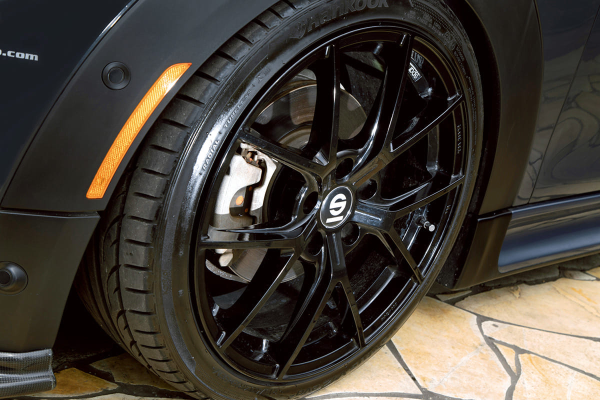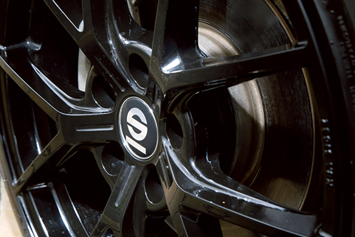 「OZジャパン」がプロデュースするスパルコホイールの最新作『ポディオ』。デモカーへの実装サイズは8×18+48(215/40)。センター部を落ち込ませ、スポークを外周まで伸ばしきったイマドキなデザインが魅力で、ゴルフ用サイズを使った同店のオリジナルセッティングにより、太さもツラ感も文句ナシだ