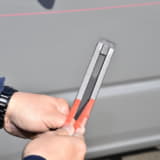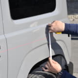 ドアハンドルの下端の高さを基準に装着するのだが、モールの水平を出すために水糸(レンガやブロックを積むときに水平を出すための糸)のような細いヒモが必要。その高さはフェンダーアーチ上部を基準に合わせる(説明書に記載されている)。