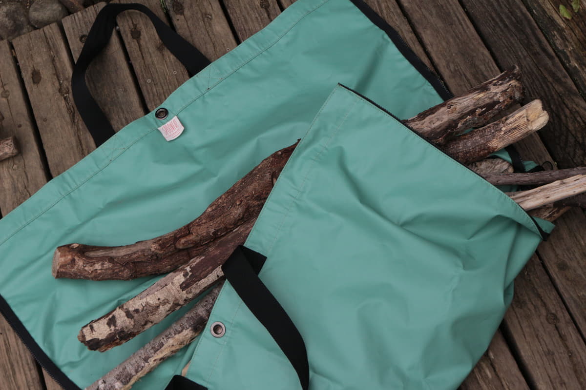 両サイドが開くトートバッグは、チェアや薪など長いものを運ぶ際に重宝する。長いものに巻き付けるようにしてもいいし、ダブルファスナーであれば底のみを開放するなんてことも可能だ。