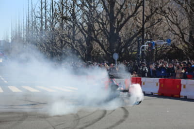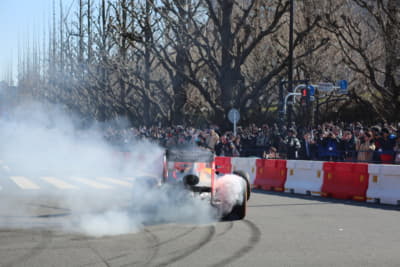 今季、「レッドブル・レーシング」チームに所属するマックス・フェルスタッペンとピエール・ガスリーの2人がショーカーに乗り込みデモンストレーションを披露。コースは、神宮外苑いちょう並木を各ドライバーが1往復(約800m)する予定だったが、最後にサプライズで2台同時に走行するシーンも見られた。ファンの前でドーナッツターンを行なうサービスも行われるなど、迫力の光景に圧倒されたことだろう。