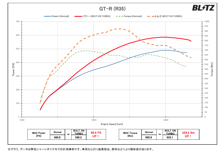 ちなみに純正タービンの価格は26.3万円×2個=52.6万円。これに対してブリッツのキットの価格は80万円(2個セット/税抜き)。なお、キットの装着には、ブースト圧、燃料、点火時期等エンジン ECUの再セッティング、インジェクターと燃料ポンプを大容量タイプへの変更が必要だ。また、この製品(社外品)を装着すると日産自動車が定める保証規定から外れることも付け加えておきたい。