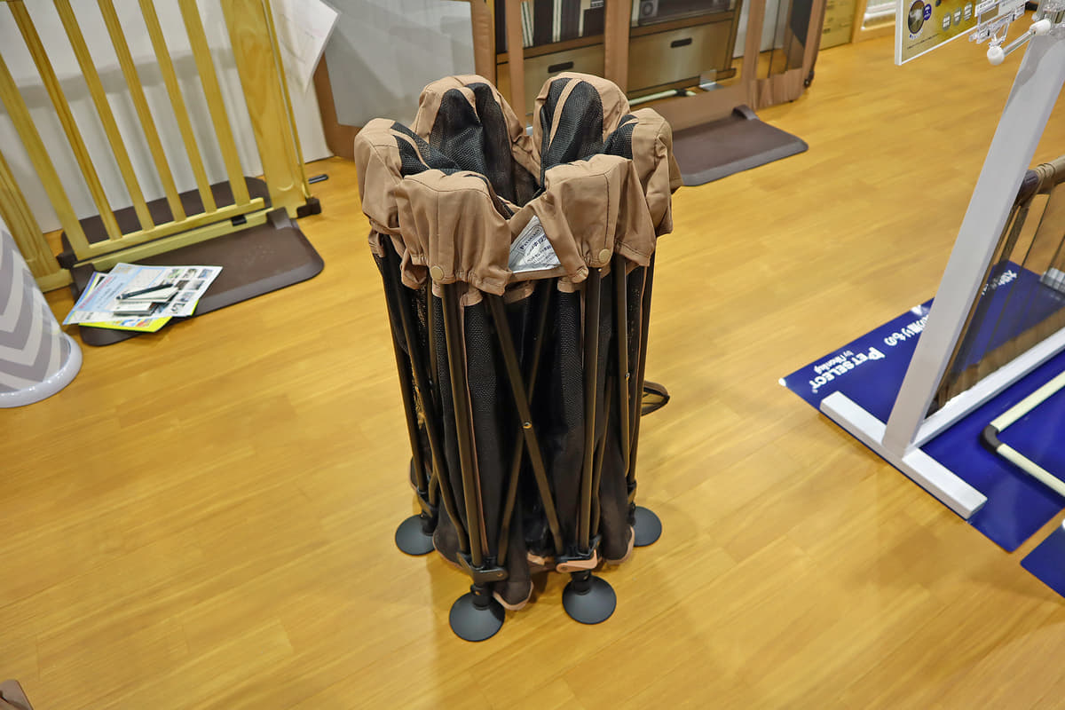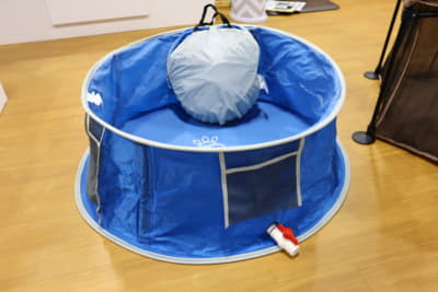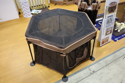 キャンプなどの各種アウトドアに愛犬を連れて行くとき、車内に放置することはできませんよね。現場でリードに繋げている人もいらっしゃると思いますが、乳幼児向けのアイテムをリリースする日本育児が展示した『たためて洗えるペットサークル』がスグレモノなんです。