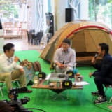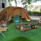 ディーラー内の特設ステージには、オリジナルキャンピングカーのA-Type脇にテントが設営され、アウトドアシーンを演出。
