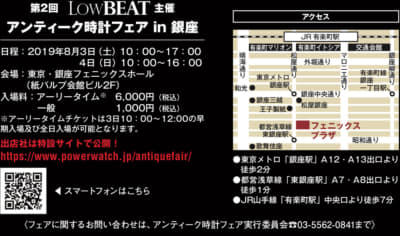 8月3日(土)〜4日(日)、アンティークウォッチの専門誌「Low BEAT(ロービート)」がアンティークウォッチの魅力をよりリアルに体験してもらうことを目的にした販売イベント『アンティーク時計フェア in 銀座』が開催される。