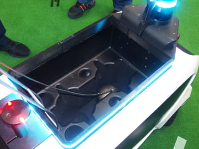 最大積載量はハンマー2個分に相当する16kg。これを積載して最高時速20kmで走れる。車両は事前に会場を走ることで周囲を高精度マップで記録。このマップとカメラなどのセンサーとAIによってを指定場所まで自律走行することを可能としている。まずは10月の茨城国体で試行の使用が予定されているという。