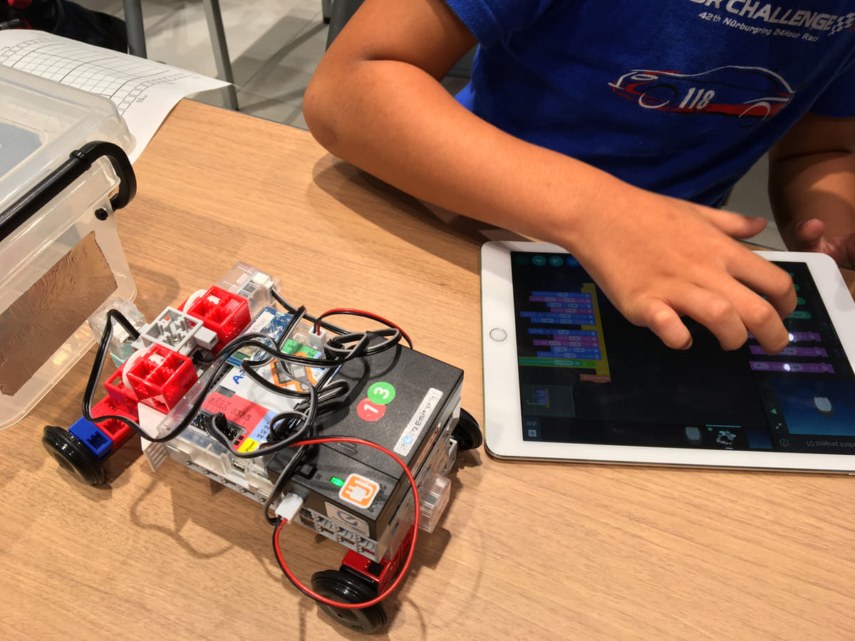 さらにiPad上でプログラムを作成し、ぶつからないロボットカーを製作する教室も開催。簡単なブロックの組み合わせでプログラミングができるので、子供でも楽しみくプログラミングを学ぶことができる。